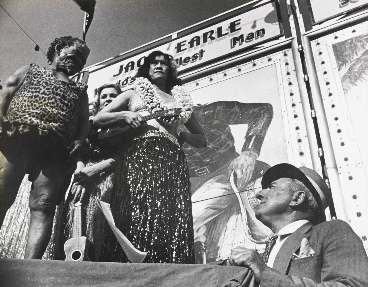 DescriptionImage of man looking up towards a stage of circus performers. One woman wears a bikini top, lei, and shimmery skirt.Copyright© Estate of Kenneth and Edna Heilbron