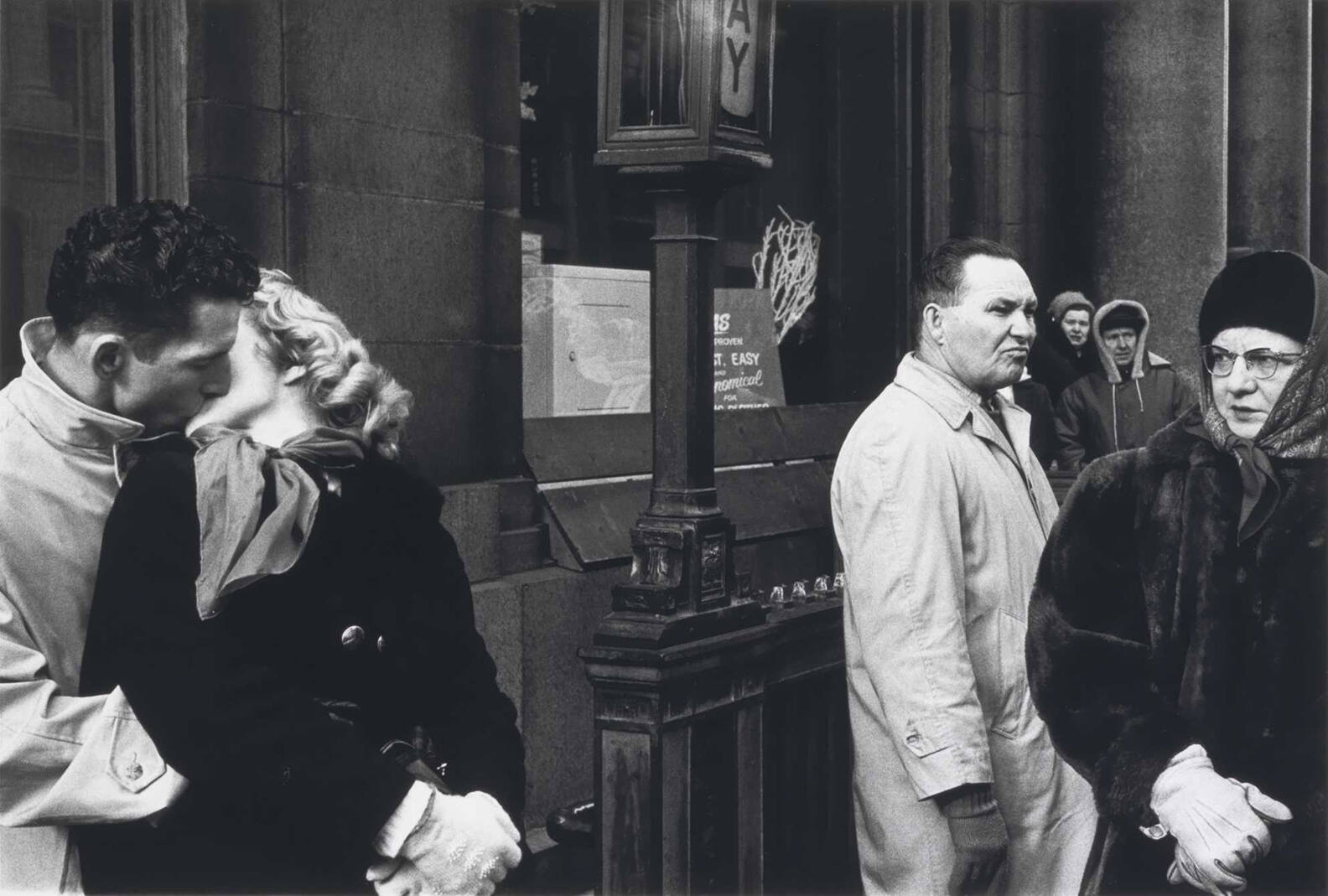 DescriptionImage of a couple kissing on a street corner with an older woman looking on disapprovingly.Copyright© Estate of Ray K. Metzker