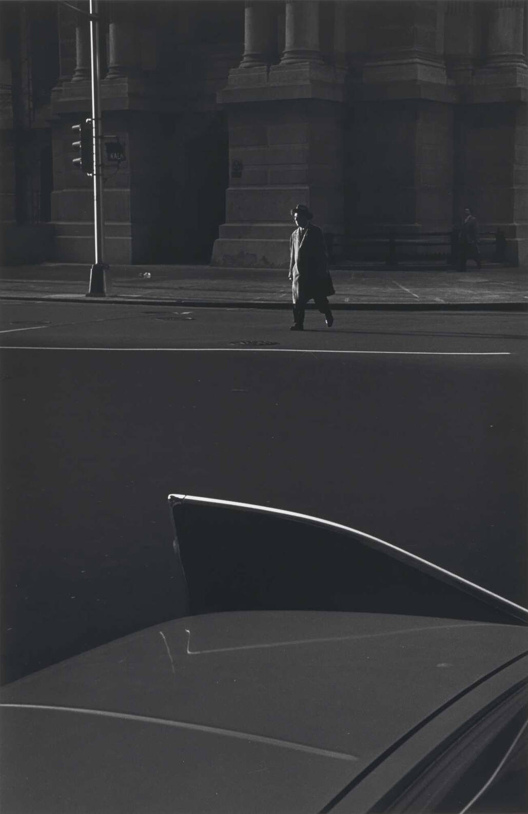 DescriptionImage of a man wearing a long coat crossing the street; foreground image is a trunk of a car.Copyright© Estate of Ray K. Metzker