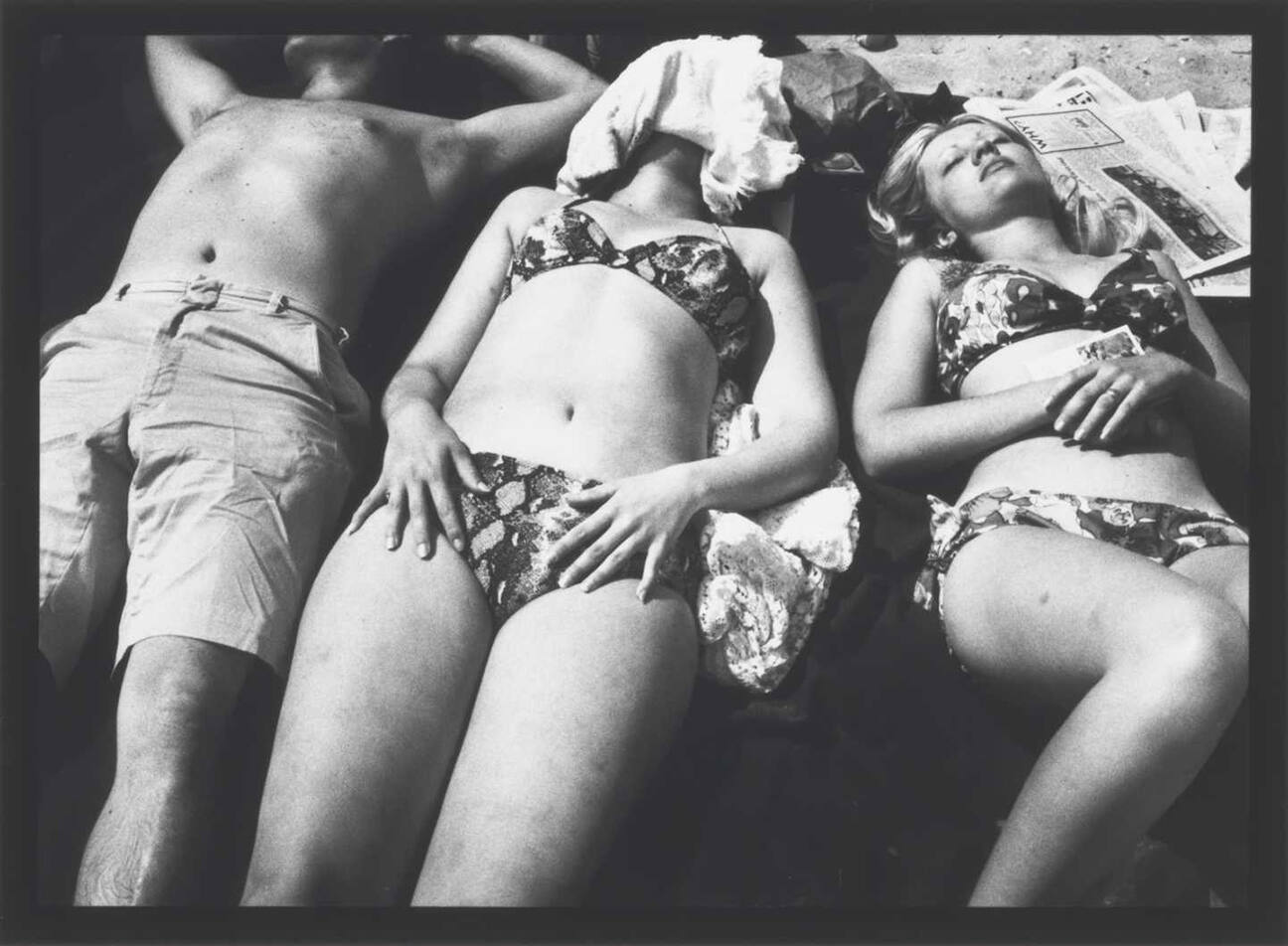 DescriptionClosely cropped image of sunbathers lying in the sand; two women wearing bikinis and one man wearing shorts.Copyright© Estate of Ray K. Metzker