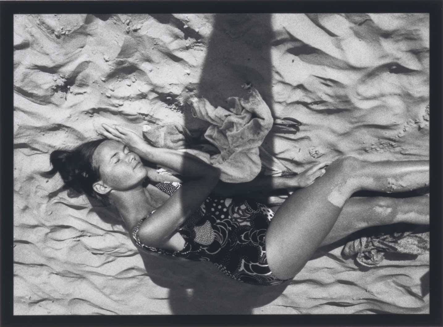 DescriptionImage of a woman in swimsuit lying on her side in the sand with eyes closed; shadow of a figure leaned over her.Copyright© Estate of Ray K. Metzker