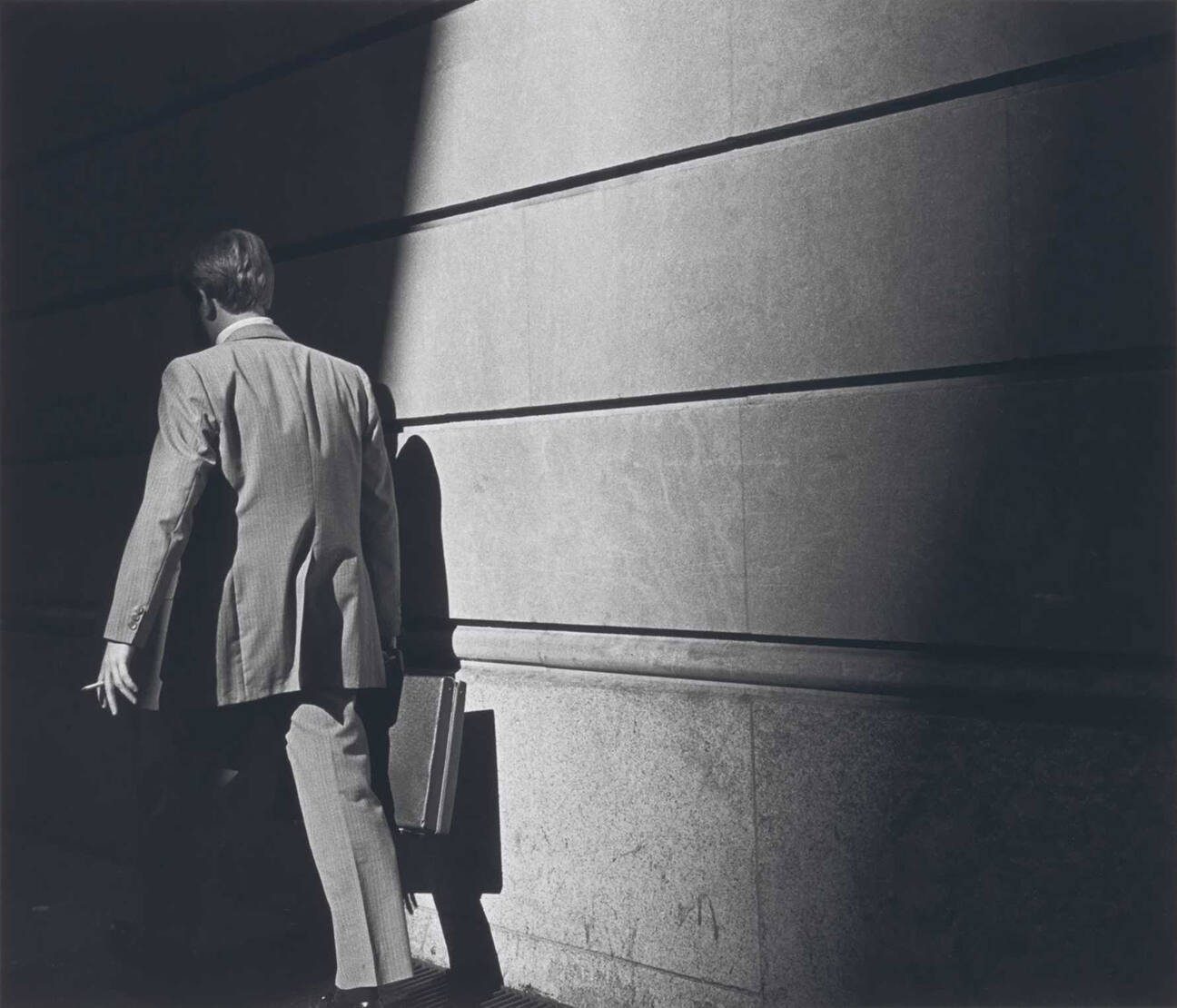 DescriptionImage of man seen from behind wearing business suit, holding a cigarette and briefcase, and walking into the shadows.Copyright© Estate of Ray K. Metzker
