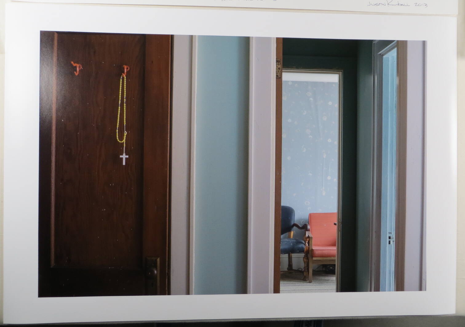 DescriptionImage of several doorways - one revealing two arm chairs. There is a rosary hanging on a coat hook mounted to the outside of closed door.Copyright© Justin Kimball