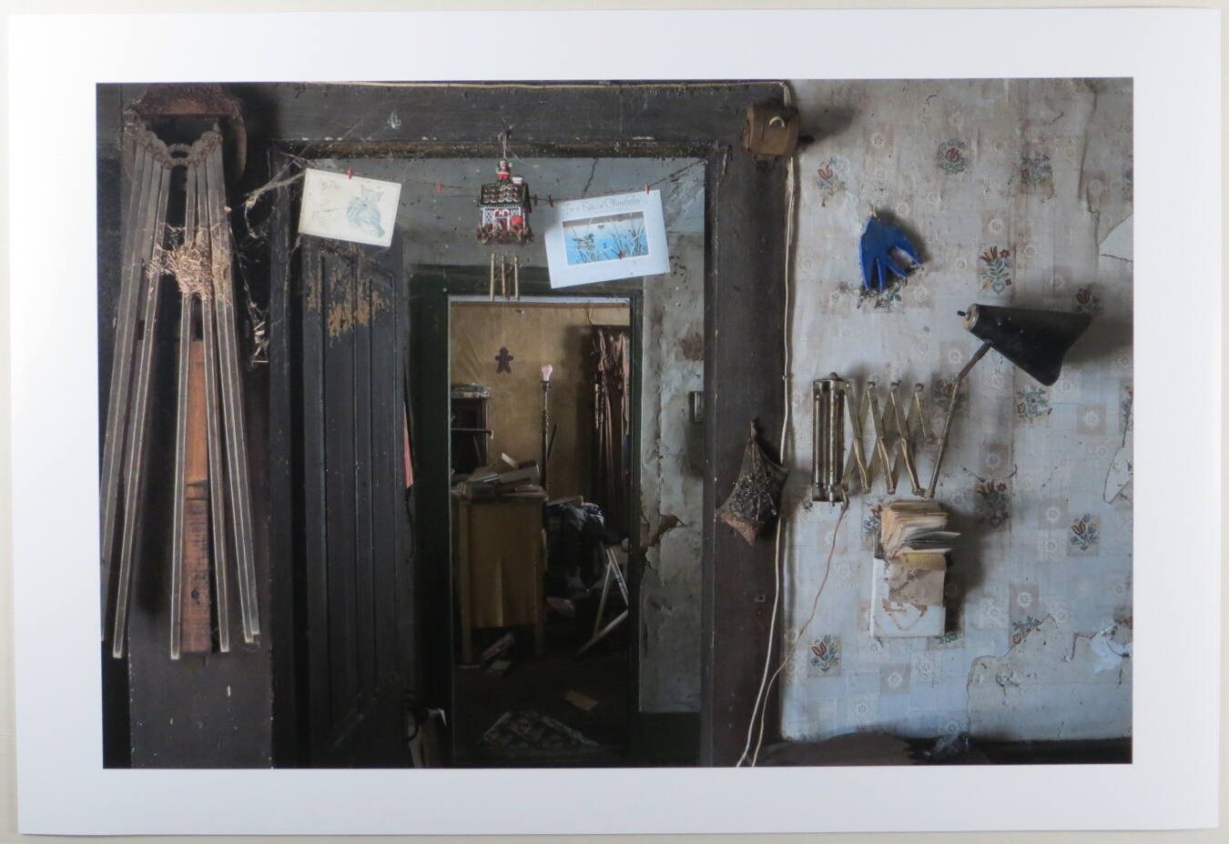 DescriptionImage of a doorway leading into a room with peeling wallpaper, a bare bulb floor lamp, and stacks of books. There are greeting cards and a Christmas decoration covered in cobwebs hanging above the doorway.Copyright© Justin Kimball