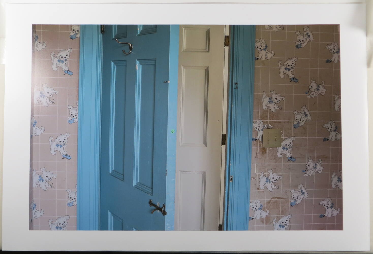 DescriptionImage of a wall with a blue door partially ajar. The door has two manual locks and the wall is covered in wallpaper with pictures of cute puppies playing.Copyright© Justin Kimball