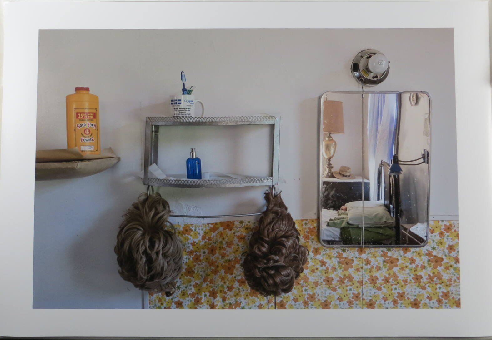 DescriptionImage of a bathroom wall with a mirror, bare bulb light fixture, yellow flowered wallpaper, and two wigs hanging from a shelf.Copyright© Justin Kimball