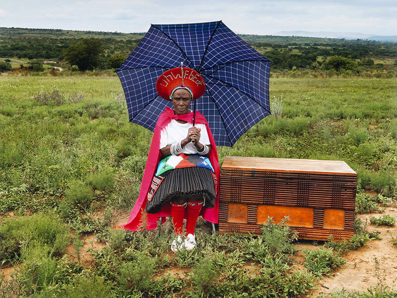 DescriptionImage of an African woman wearing red socks, cape, and hat while sitting next to a wooden chest in the middle of a field.Copyright© Zwelethu Mthethwa