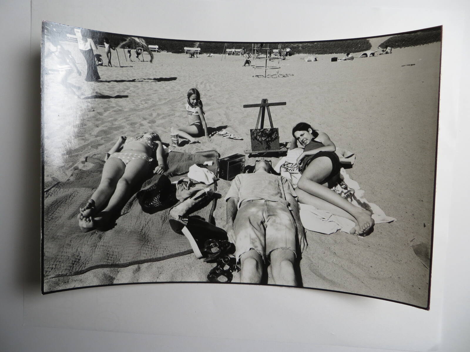 DescriptionImage of two women lying on the beach with man lying in between them.Copyright© Mike Mandel