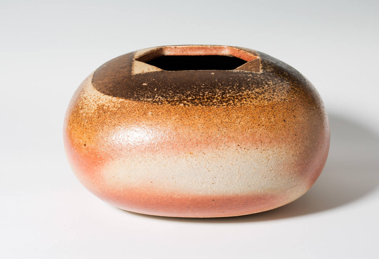 DescriptionRounded rectangular stoneware pot with hexagonal opening at the top, glazed with brown, beige and orange on the exterior and dark brown on the interior.Copyright© Victor Babu