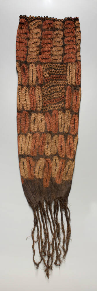 DescriptionThis skirt is tube-like and woven from raffia, a natural fiber, which gives it an elastic feel. It has beige and orange dyed oval patterns over a dominant dark brown background. In use, its tube-like form would have fitted over the loins of a woman with the tasseled end hanging around the feet.ProvenanceGaylord Torrence, Kansas City, MO, ca. 2003-2013 [1];