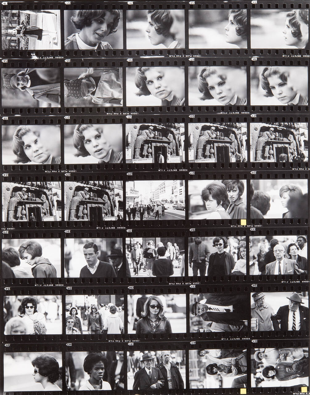 DescriptionContact sheet of Guggenheim work Roll #92-98; upper left frame is an image of a woman wearing a knee-length dress with a white peter pan collar.ProvenanceHall Family Foundation, Kansas City, MO, 2013;