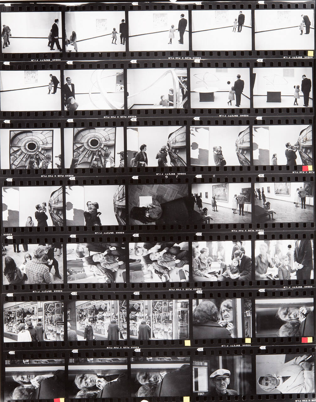 DescriptionContact sheet of Guggenheim work Roll #183-189; upper left frame is an image of a man wearing a suit and holding a child's hand in an art museum.ProvenanceHall Family Foundation, Kansas City, MO, 2013;