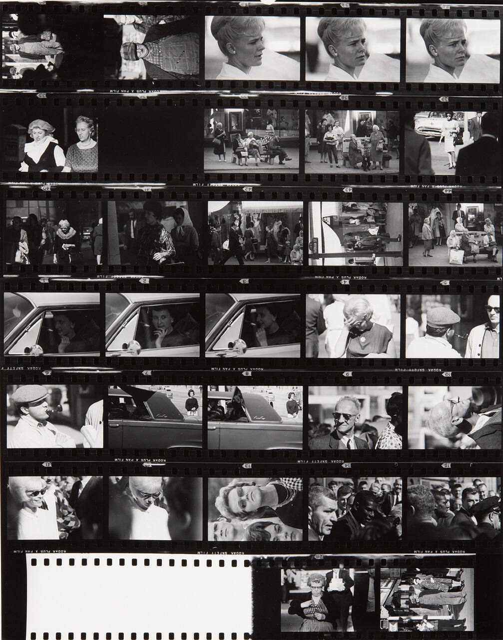 DescriptionContact sheet of Guggenheim work Roll #365-371; upper left frame is an image of people walking outside - partially obstructed by dark figure in foreground.ProvenanceHall Family Foundation, Kansas City, MO, 2013;