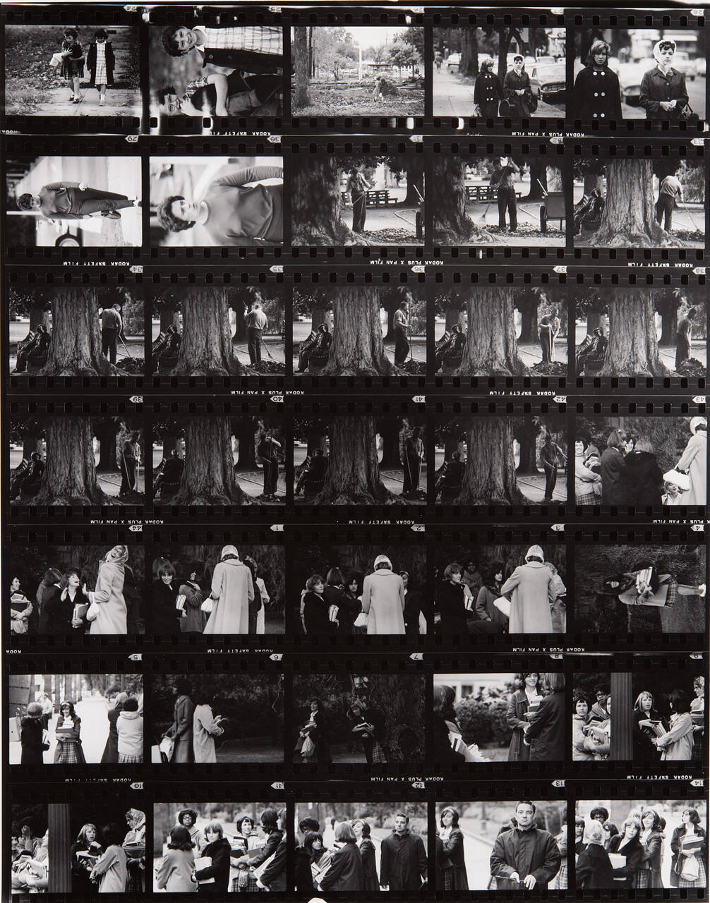 DescriptionContact sheet of Guggenheim work Roll #672-677; upper left frame is an image of a man sweeping leaves with a push broom beside a curb.ProvenanceHall Family Foundation, Kansas City, MO, 2013;