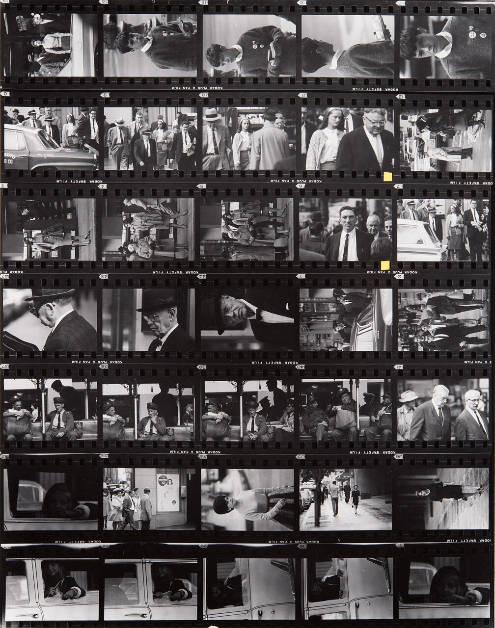 DescriptionContact sheet of Guggenheim work Roll #816-822; upper left frame is an image of a woman standing on the sidewalk with men walking nearby and a car passing in front.ProvenanceHall Family Foundation, Kansas City, MO, 2013;