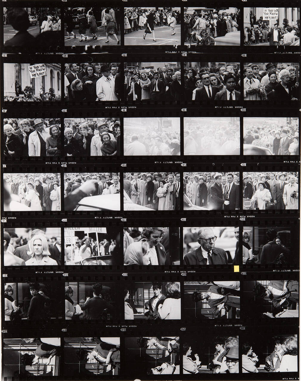 DescriptionContact sheet of Guggenheim work Roll #928-934; upper left frame is an image of a large crowd gathered on the street; dark and blurry figure in the foreground.ProvenanceHall Family Foundation, Kansas City, MO, 2013;