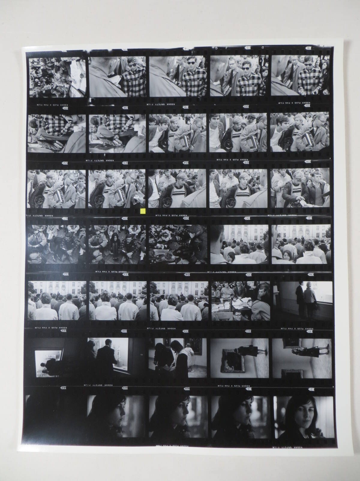 DescriptionContact sheet of Guggenheim work Roll #1394-1400; upper left frame is an image of a man seated at table with stacks of papers; crowd behind - some wearing arm bands.ProvenanceHall Family Foundation, Kansas City, MO, 2013;