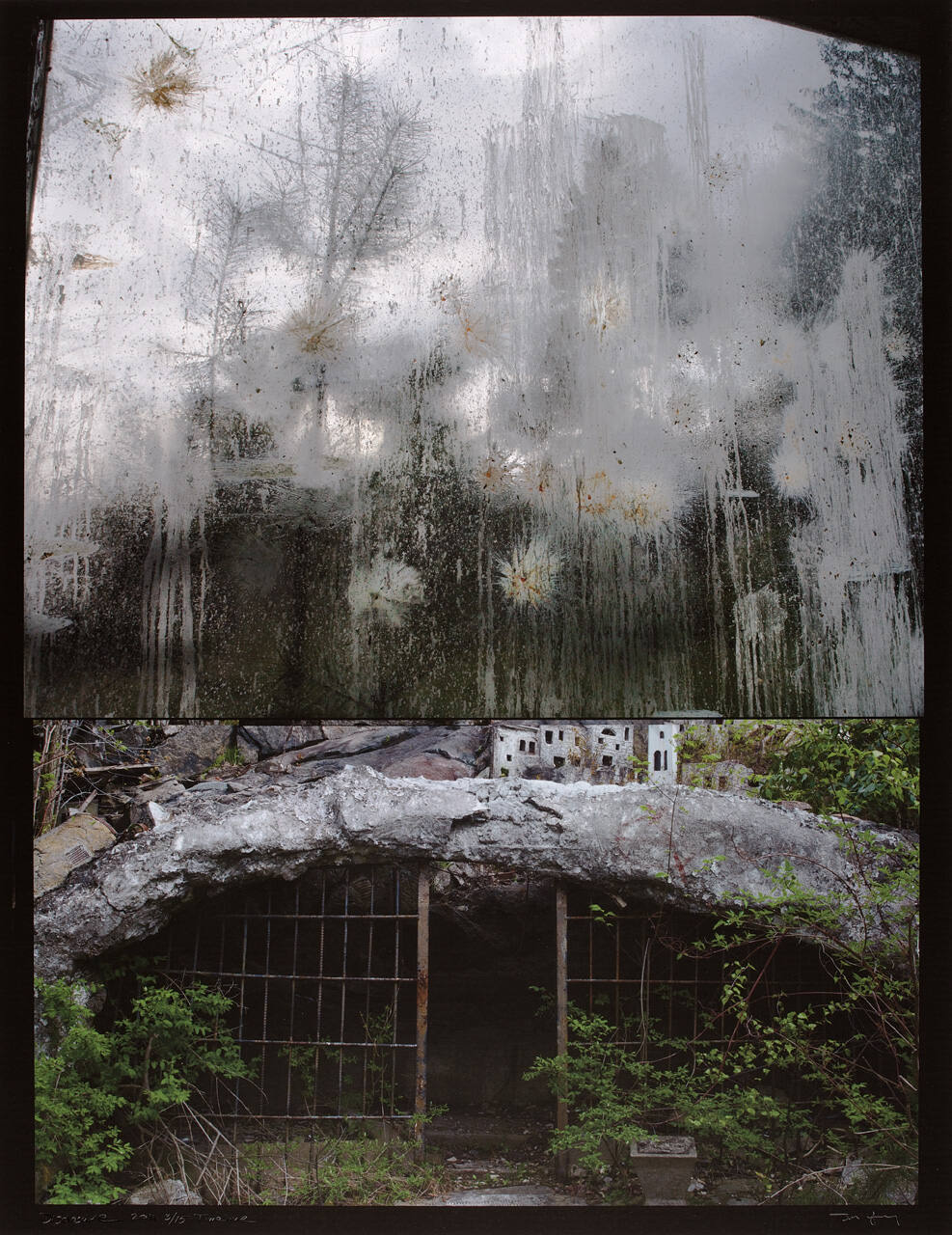 DescriptionTop image is of trees as seen through dirty window; bottom image is of metal gate below stone archway with leaves and branches surrounding.Copyright© Tom Young
