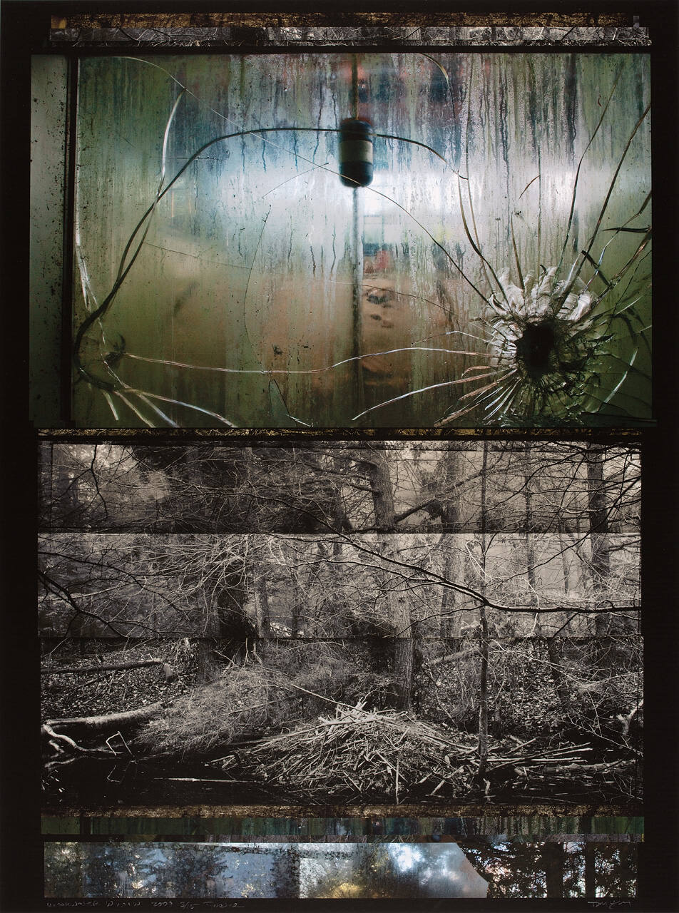 DescriptionThree images presented as one - top image of broken window; center black-and-white image of trees and branches; bottom image of trees as seen through window panes.Copyright© Tom Young