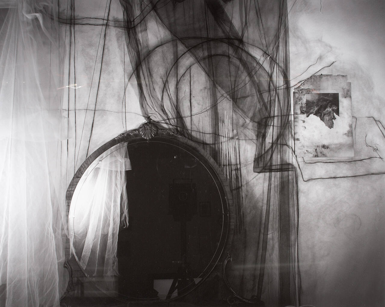 DescriptionArchival inkjet print. Image of a round mirror with transparent fabric and charcoal line drawings on wall behind.Copyright© Lauren Semivan