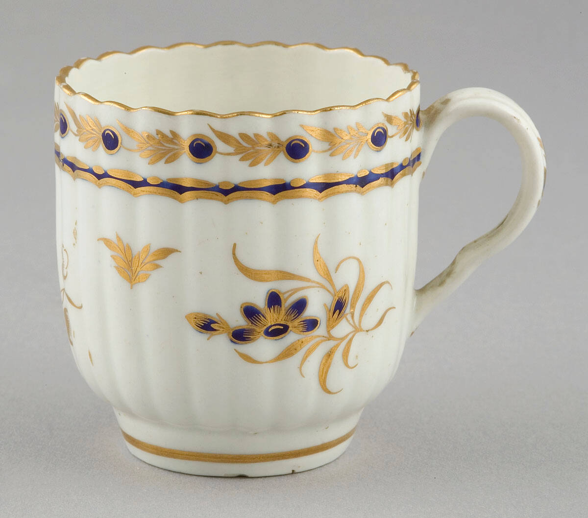 DescriptionDemitasse cup of white porcelain with fluted sides, decorated with single flower and leaf designs in gold and blue, and continuous leaf pattern around top.ProvenanceMargaret Cameron Chapman (née Mann, 1865-1935), Kansas City, MO, by 1935;