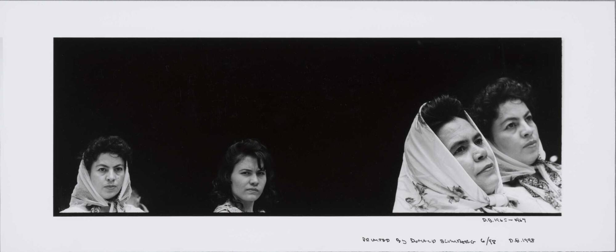 DescriptionPanoramic image composed of contiguous frames showing several women with head scarfs against a black background.Copyright© Donald Blumberg