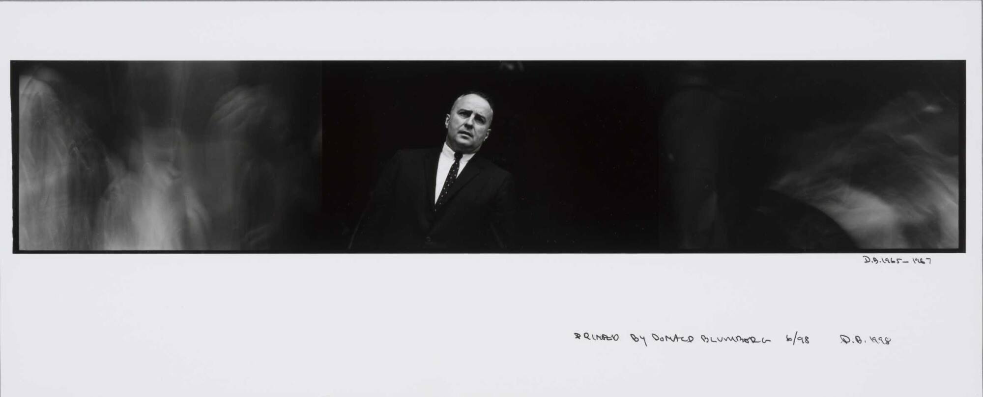 DescriptionPanoramic image of a man wearing a suit and tie flanked on either side by blurry figures.Copyright© Donald Blumberg