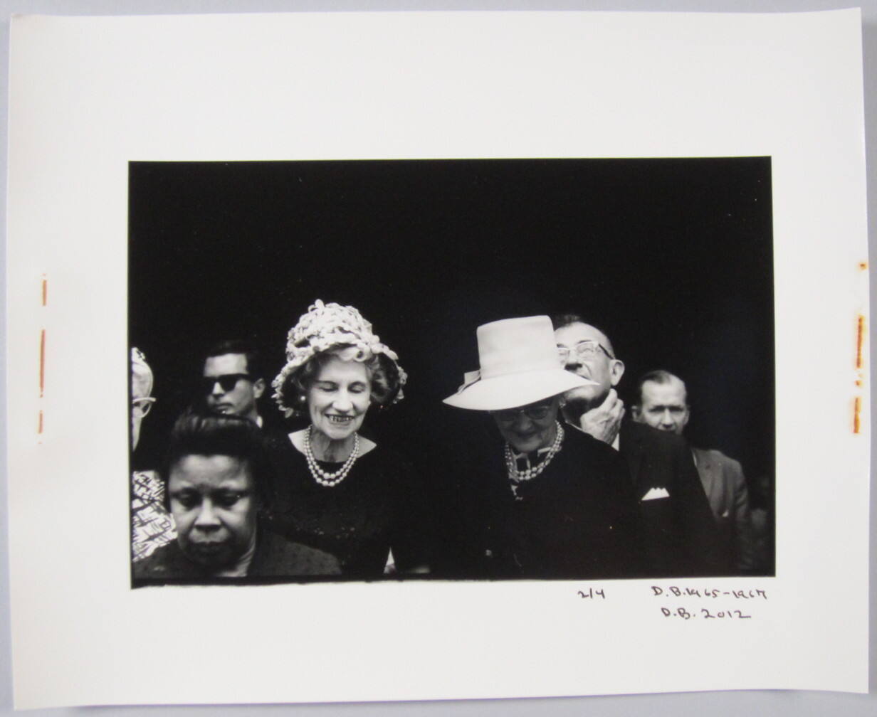 DescriptionImage of a crowd with two women wearing hats and pearls while looking down and smiling.Copyright© Donald Blumberg