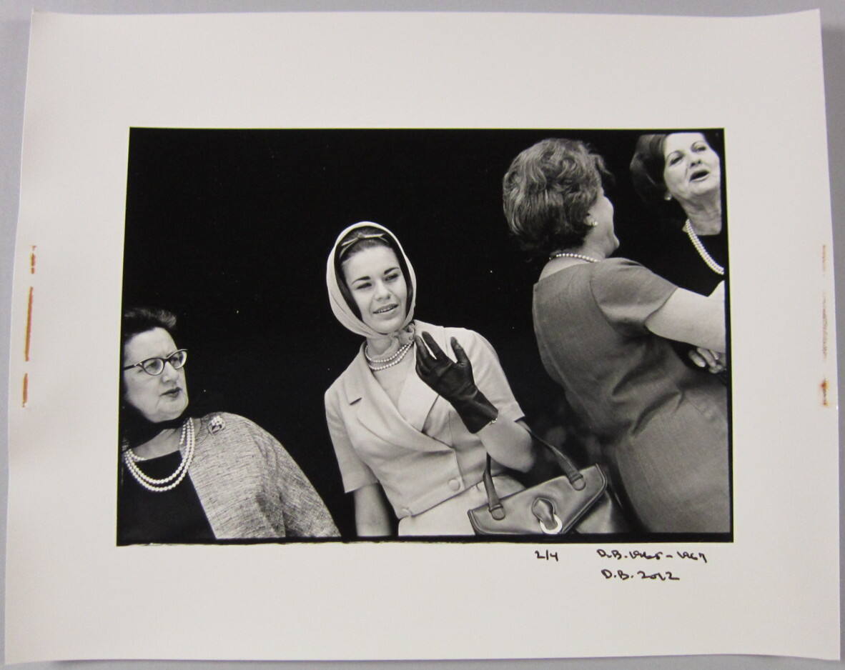 DescriptionImage of four women; one is holding purse and wearing leather glove with dress suit, headscarf and pearls.Copyright© Donald Blumberg
