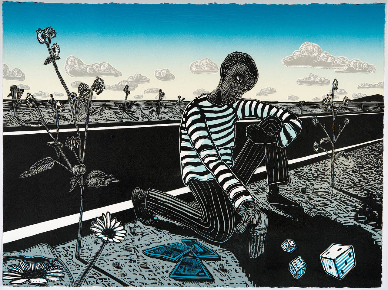 DescriptionYoung boy by the side of the road, on one knee shooting dice. He is barefoot as he has already lost his shoe to the game. His right hand is open as he has released the dice.There are several flowers by the side of the road as well. He is dressed in striped clothing..This is a story influenced by the artist’s work at a juvenile detention facility. A young man has escaped a prison and is gambling by the side of the road. Creightney correlates this scene to his decision to become an artist and uses his own self-portrait as the character of the scene- he says he has escaped the prison of a drudgery job but that the life of an artist is a gamble. The bright blue sky is there as a symbol of hope.