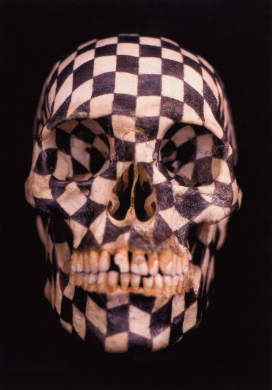 DescriptionThe subject of this 12 x 10 inch inkjet print on paper is a close-up, frontal view of a human skull positioned against a stark black background. A meticulously drawn grid-like pattern covers the skull. With the exception of the teeth, which remain unembellished, this black-and-white checkerboard covers the entire surface of the skull, including the hollows of its eye sockets and nasal cavity. Adapting to the skull’s crevices, contours, and irregularities, the grid of squares is occasionally stretched and distorted.Copyright© Gabriel Orozco