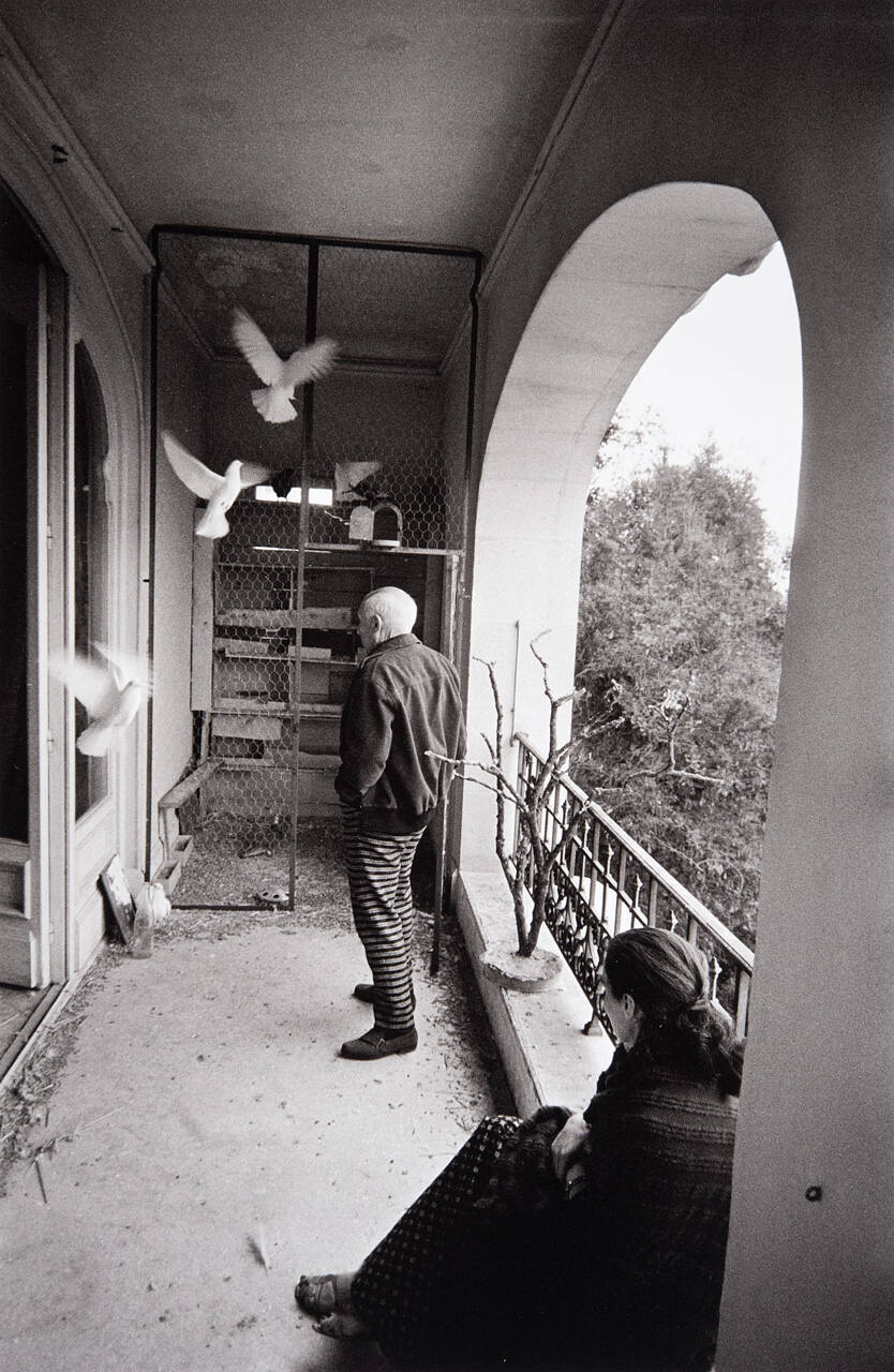 DescriptionImage of Picasso standing on balcony near pigeon cage.Copyright© Harry Ransom Center, The University of Texas at Austin