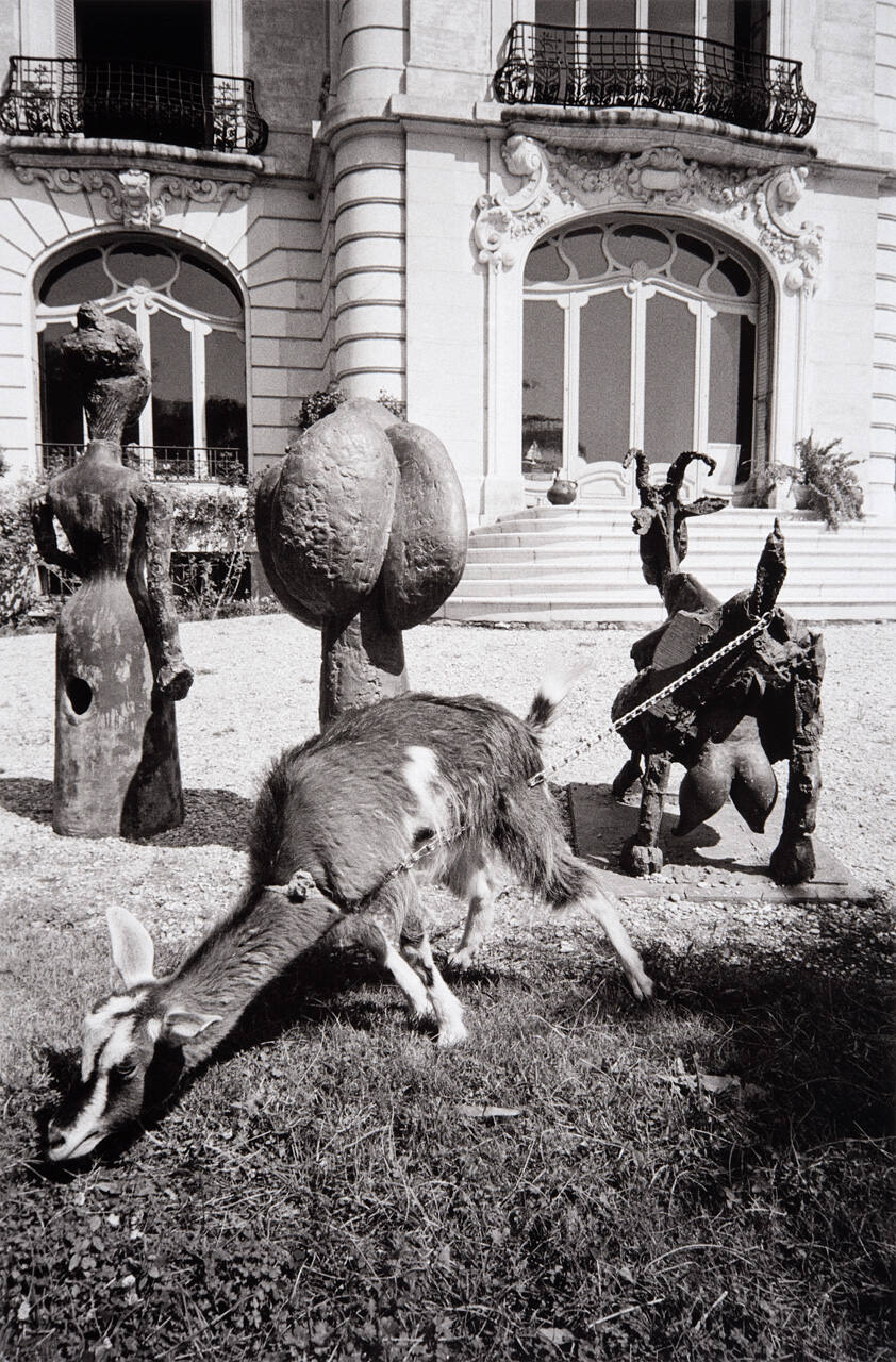 The rear of La Californie. Bronze Pregnant Goat, 1950. Tied to her is the pet nannygoat. Picasso's bedroom is second-floor window, left; dining room is directly below it. Jacqueline's and Katherine Hutin's sitting room is on second floor above steps; living room is beyond the front steps.