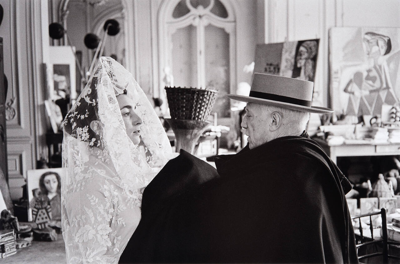 DescriptionImage of Picasso wearing a cape and standing across from Jacqueline who is wearing a lace veil.Copyright© Harry Ransom Center, The University of Texas at Austin