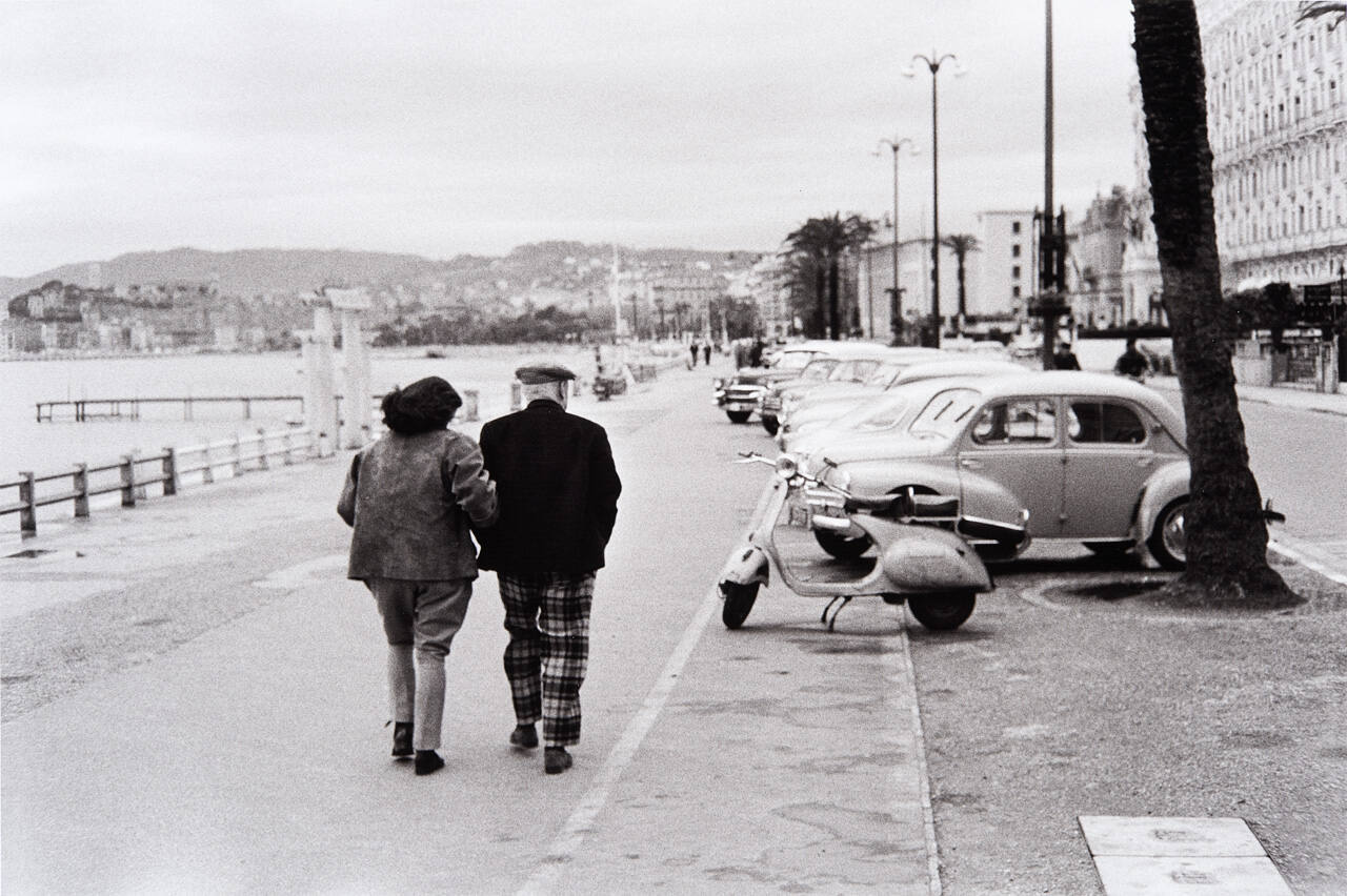 Picasso and Jacqueline walking along the beach in Cannes