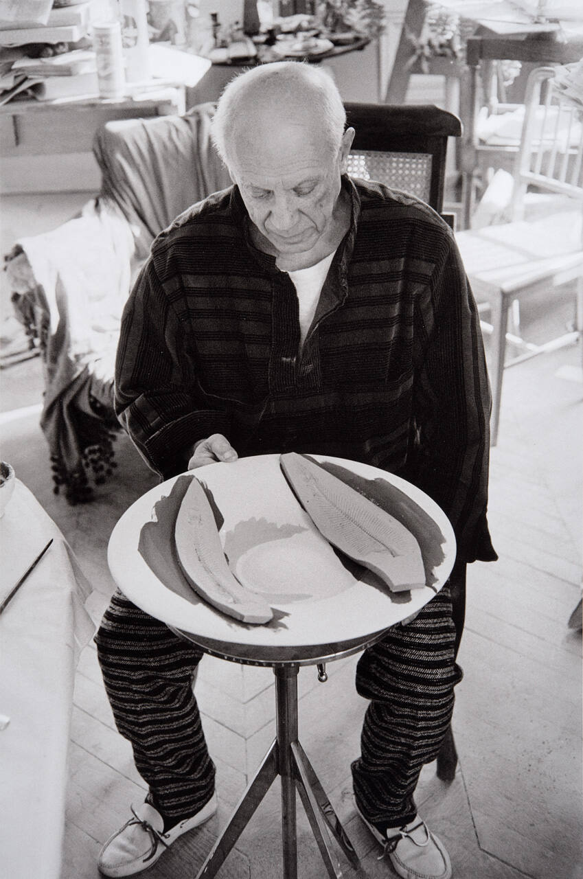 DescriptionImage of Picasso seated in front of platter with fish skeletons.Copyright© Harry Ransom Center, The University of Texas at Austin