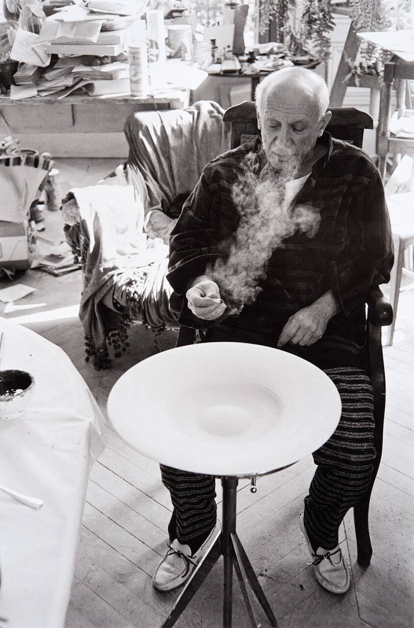 DescriptionImage of Picasso seated near platter while smoking.Copyright© Harry Ransom Center, The University of Texas at Austin