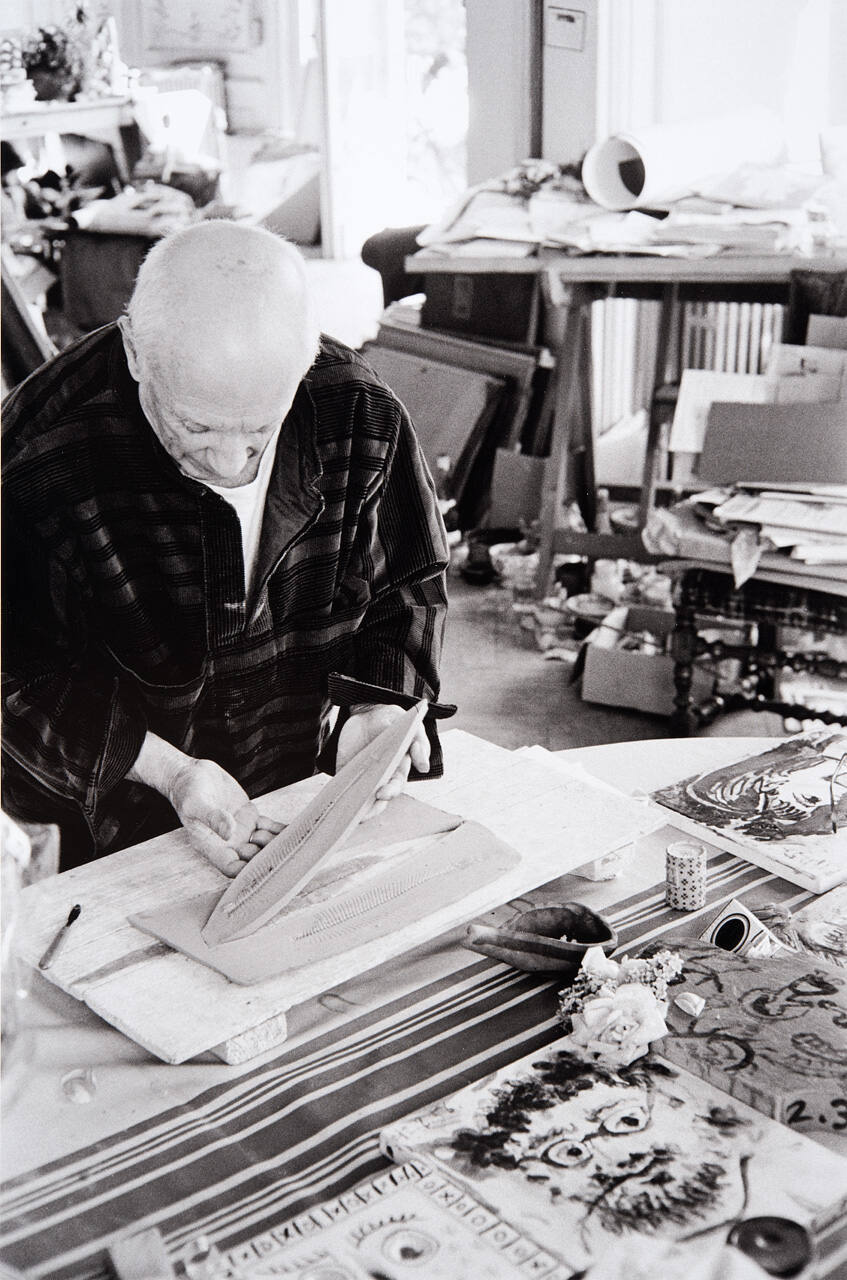 DescriptionImage of Picasso holding fish skeleton made of clay.Copyright© Harry Ransom Center, The University of Texas at Austin