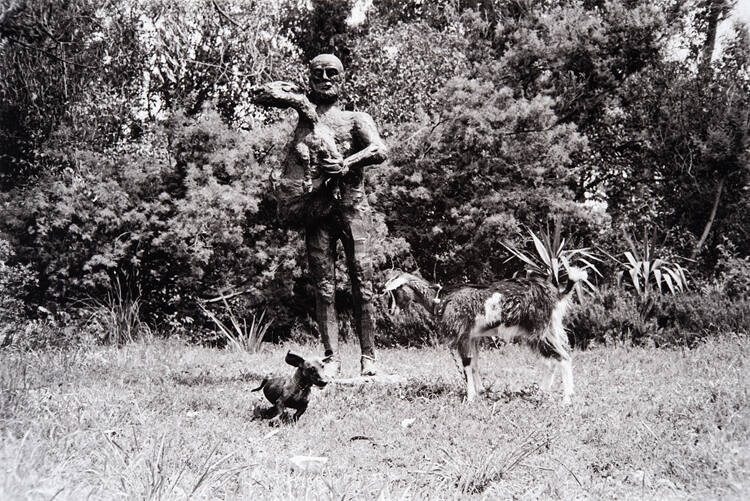 Lump, the dachshund, meets the pet goat for the first time, in garden. Goat is tethered to bronze statue, "Man with a Sheep" or "Shepherd Carrying a Lamb" (1944). Over seven feet tall.