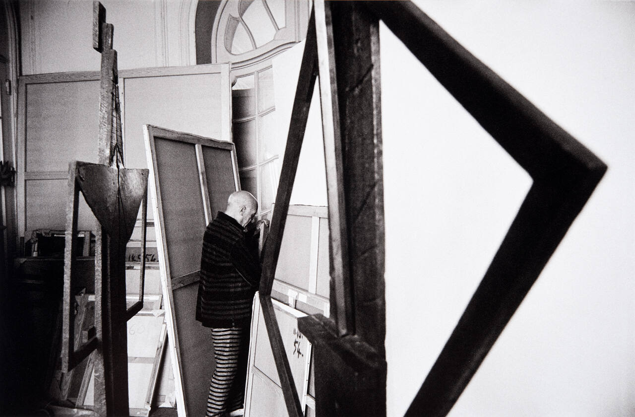 DescriptionImage of Picasso in his studio surrounded by frames.Copyright© Harry Ransom Center, The University of Texas at Austin