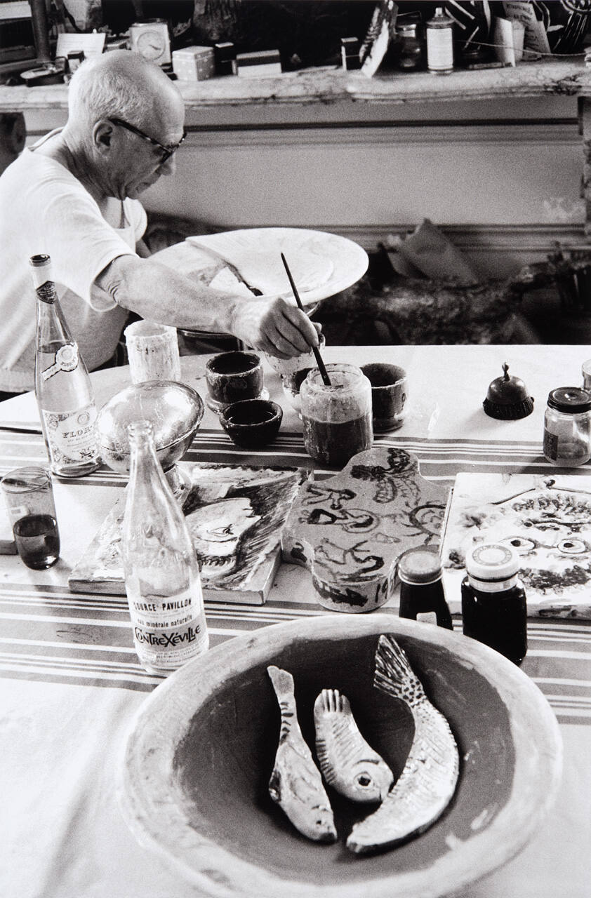 DescriptionImage of Picasso dipping paintbrush in water while working on platter.Copyright© Harry Ransom Center, The University of Texas at Austin