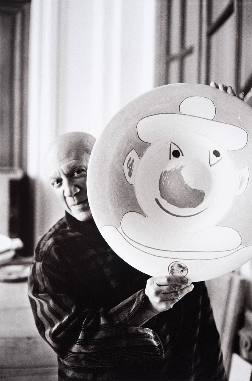 DescriptionImage of Picasso smiling while holding up platter with painted clown face.Copyright© Harry Ransom Center, The University of Texas at Austin