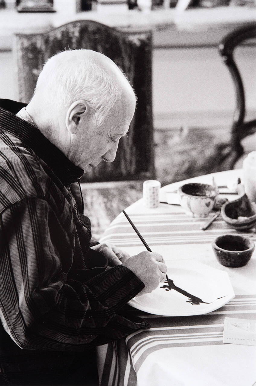 Pablo Picasso adds the dedication to the souvenir luncheon plate he has just painted for Lump, David Douglas Duncan's daschund