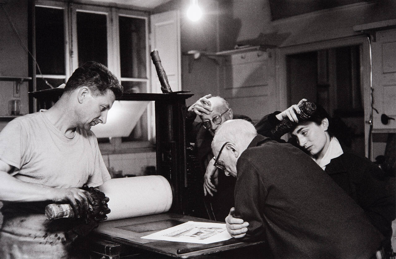 Jaime Sabartés, Jacques Frélaut (master printer), Jacqueline and Picasso examining aquatint proof, basment of La Californie