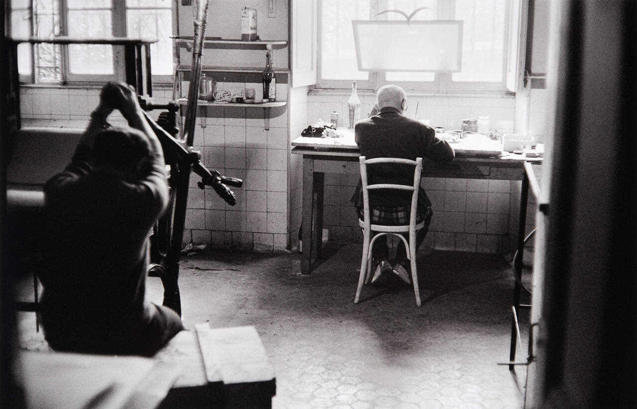 Jacqueline sits on an empty box in basement of villa, which Picasso converted into engraver's printing plant, while he etches the copper plates of the bullfight series. Picasso works by the window revetment.