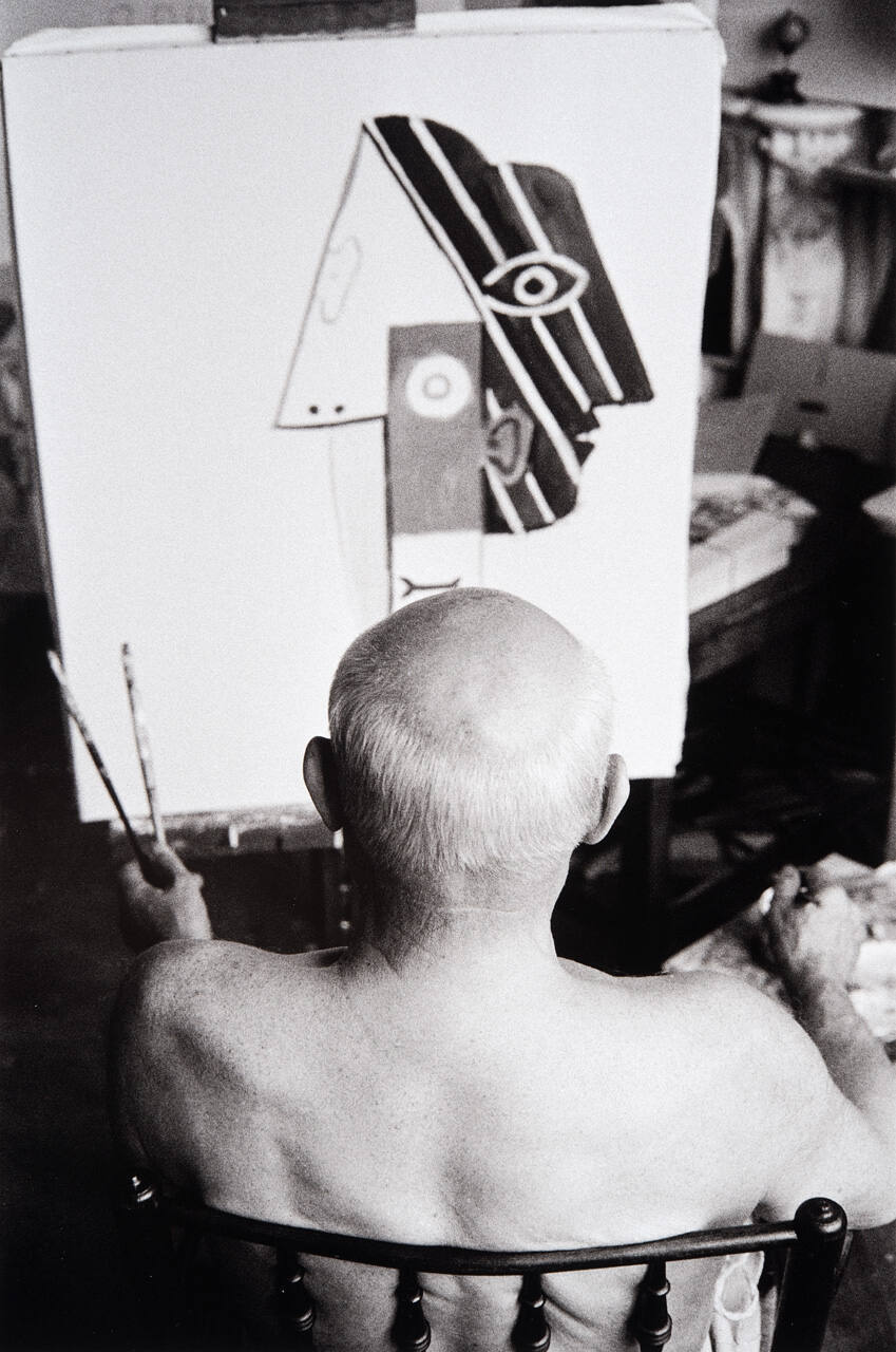 DescriptionImage of Picasso holding two paintbrushes while seated in front of partially painted portrait.Copyright© Harry Ransom Center, The University of Texas at Austin