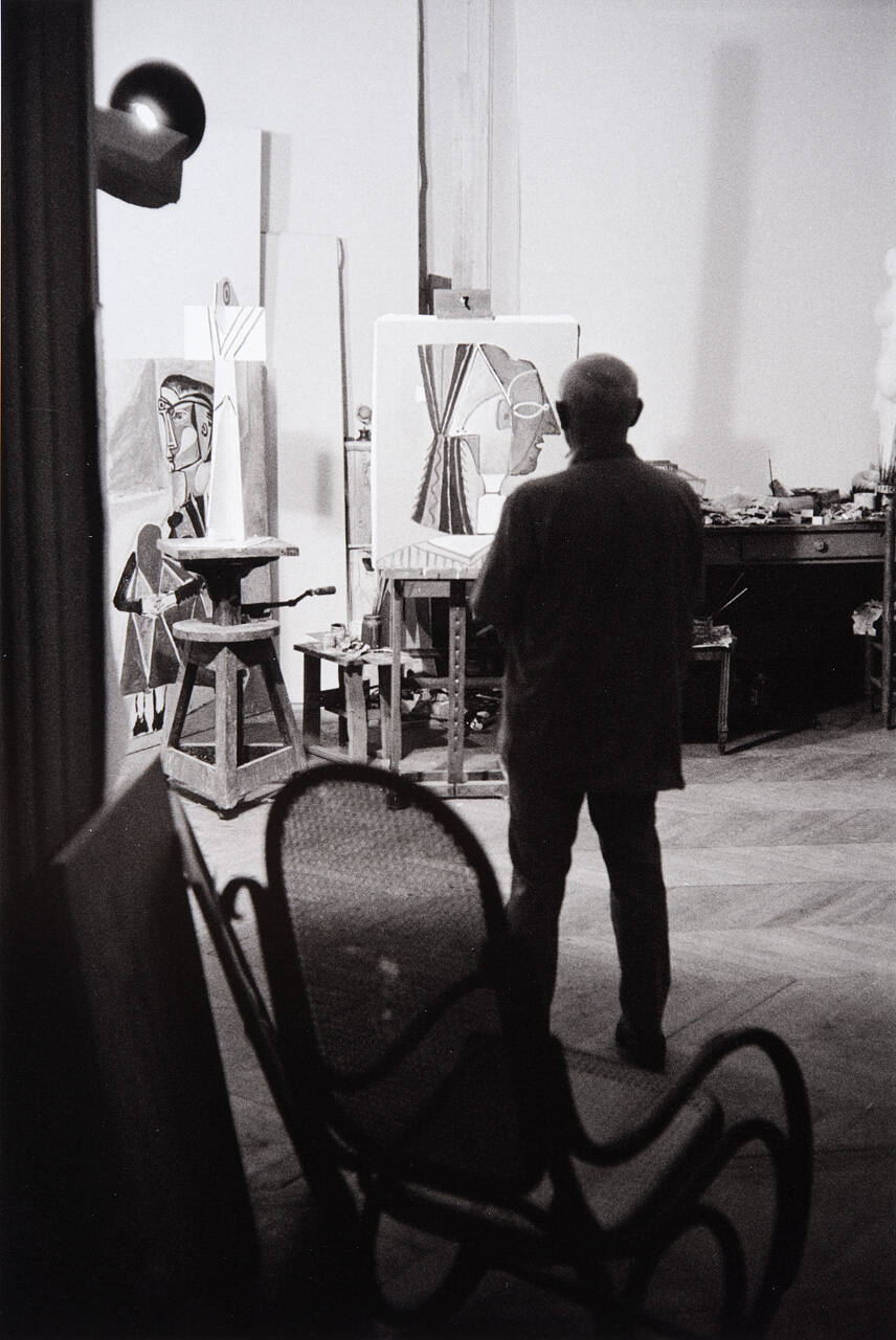 DescriptionImage of Picasso standing in studio; rocking chair in foreground.Copyright© Harry Ransom Center, The University of Texas at Austin