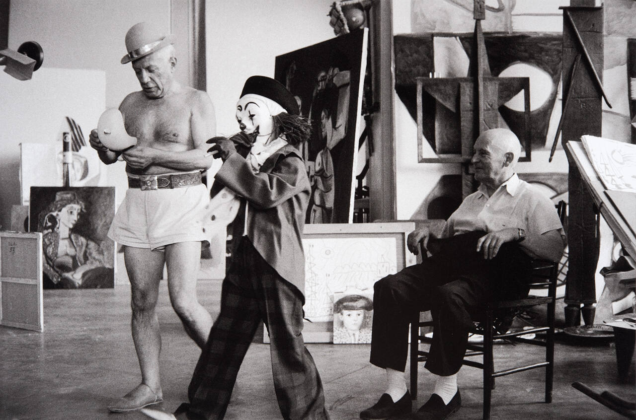 DescriptionImage of Picasso wearing small bowler hat and standing next to child dressed as clown.Copyright© Harry Ransom Center, The University of Texas at Austin