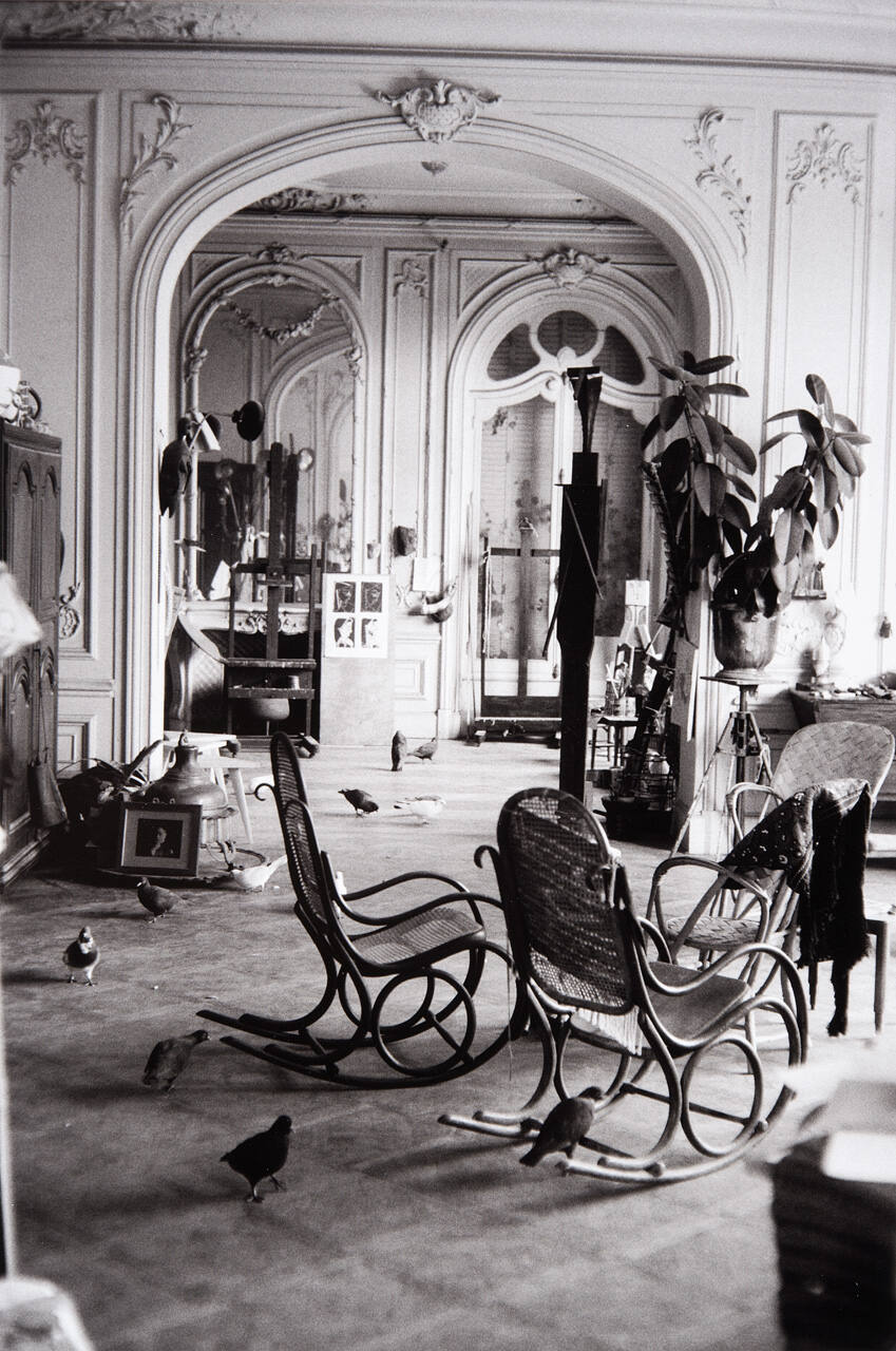 DescriptionInterior image with rocking chairs and pigeons.Copyright© Harry Ransom Center, The University of Texas at Austin