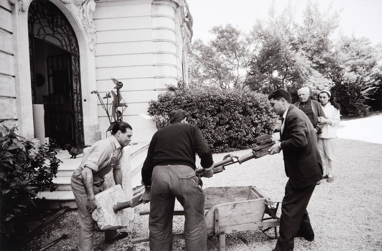 DescriptionImage of several men lifting sculpture out of wheelbarrow; Picasso and Jacqueline standing nearby.Copyright© Harry Ransom Center, The University of Texas at Austin
